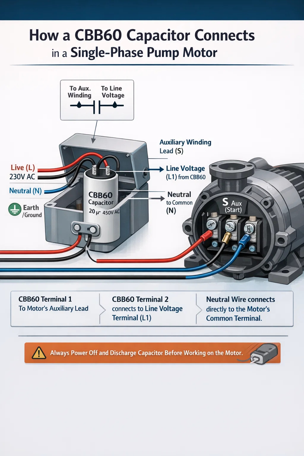 Im häufigsten Szenario – einem einphasigen Pumpenmotor mit einem externen Kondensatorkasten – landen das eingehende stromführende Kabel und das Hilfskabel des Motors beide am CBB60, während der Neutralleiter direkt mit der gemeinsamen Klemme des Motors verbunden ist. Der Motor läuft, weil der Strom durch den Kondensator der Versorgungsspannung um etwa 90 Grad voreilt und so das rotierende Magnetfeld erzeugt, das eine einphasige Versorgung allein nicht erzeugen kann.