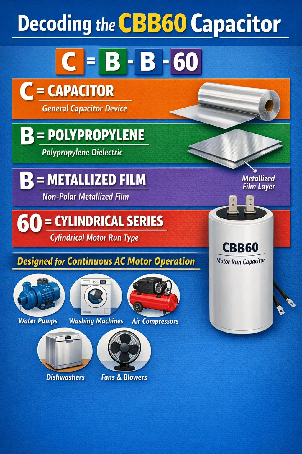 Auf einer elektrischen Komponente der Begriff CBB60 ist ein chinesischer Industriestandardcode (GB), der das spezifische dielektrische Material und die Funktionskategorie des Kondensators identifiziert. Im Klartext steht CBB60 für a Motorbetriebskondensator aus metallisierter Polypropylenfolie geformt in einem zylindrischen Gehäuse. Diese Komponente ist speziell darauf ausgelegt, bei laufendem Motor kontinuierlich in einem Wechselstromkreis zu bleiben und für die notwendige Phasenverschiebung zu sorgen, um das Drehmoment und die Effizienz des Motors aufrechtzuerhalten.