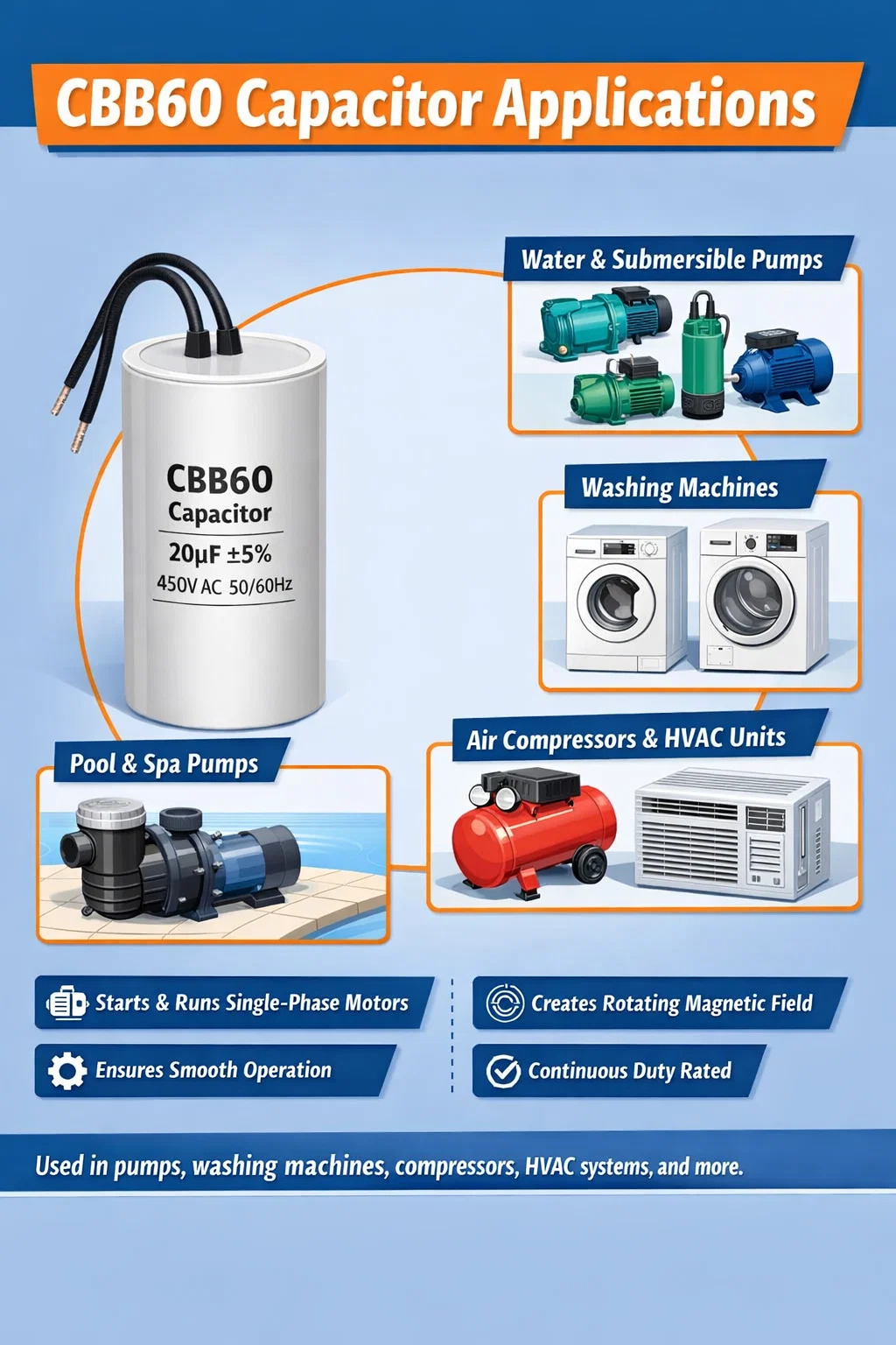 Umwälzpumpen für Pools und Spas, Pumpen für Bewässerungssysteme, Motoren für die Getreideverarbeitung, kleine Drehmaschinen und sogar einige Kühlkompressoren in gewerblichen Kühlschränken nutzen CBB60-Kondensatoren. Bei jeder Anwendung, in der ein einphasiger Induktionsmotor mit Permanent-Split-Kondensator (PSC) oder Kondensator-Start-Kondensator-Betrieb (CSCR) betrieben wird, kann möglicherweise ein CBB60 in der Betriebsposition verwendet werden.