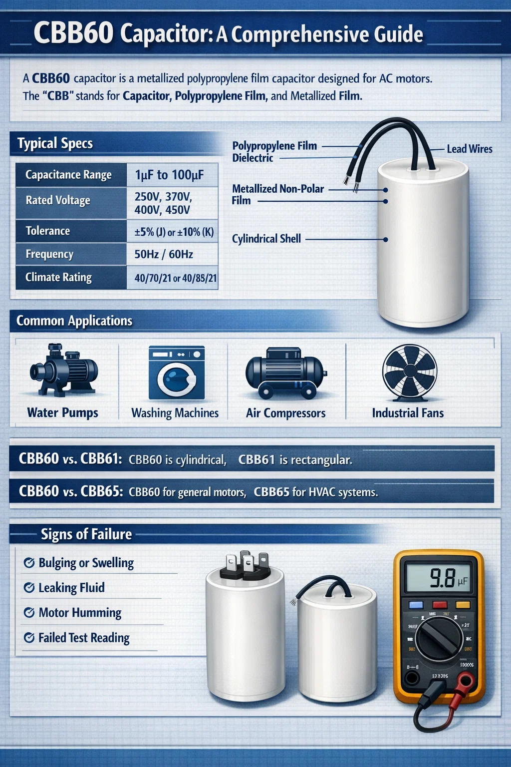 - Tests: Ein fehlerfreier CBB60 sollte beim Test mit einem Multimeter innerhalb von ±5 % seines Nennwerts in Mikrofarad (µF) liegen.