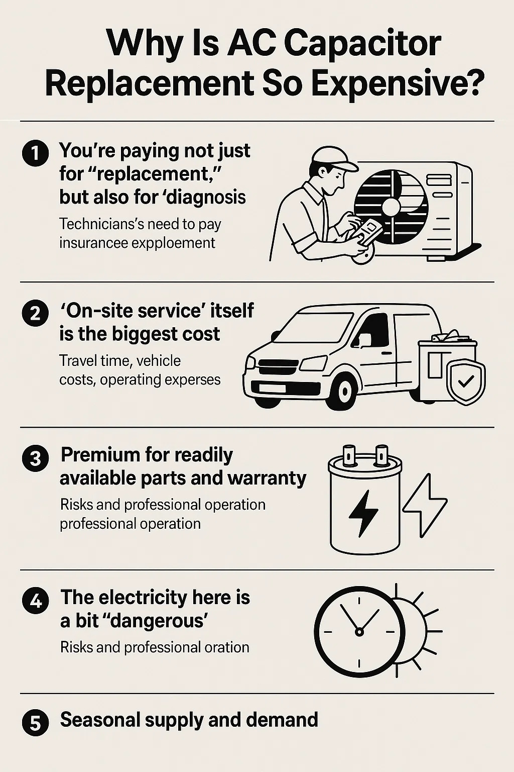 Der Wert der Diagnose: Wenn ein Techniker zu Ihnen nach Hause kommt, muss er zunächst ein Multimeter und andere Werkzeuge zur Fehlerbehebung verwenden. Wenn der Kondensator kaputt ist, ist das ein kleines Problem; Wenn der Techniker jedoch unerfahren ist und es fälschlicherweise als Kompressorfehler diagnostiziert, müssen Sie möglicherweise unnötigerweise für den Austausch einer größeren Komponente bezahlen.